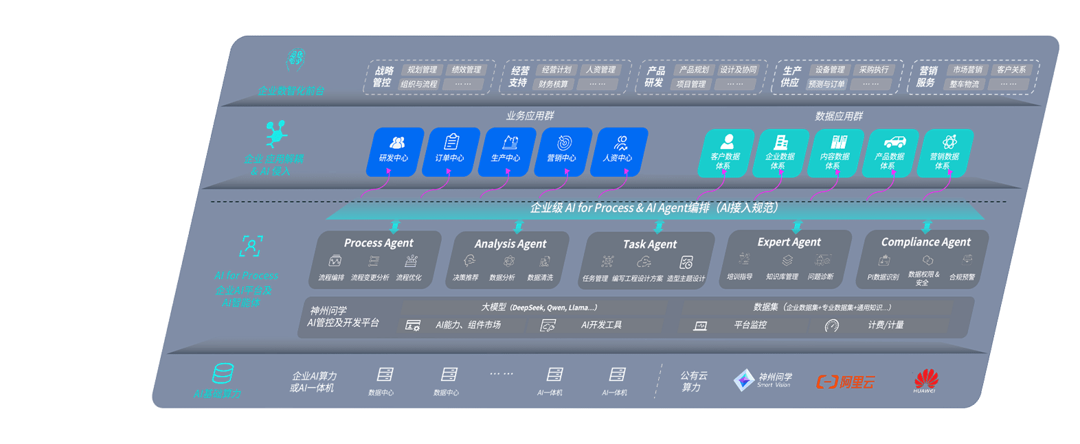 端到端的一站式AI工作空间深度融合了从企业战略规划到日常经营的全流程业务板块,,,定向解决车企内部领域多、、部门多、、、、链条长、、场景碎片化等难题,,支持车企快速构建以AI为核心的生产力写作体系,,,实现任务执行与AI能力的无缝集成与交互