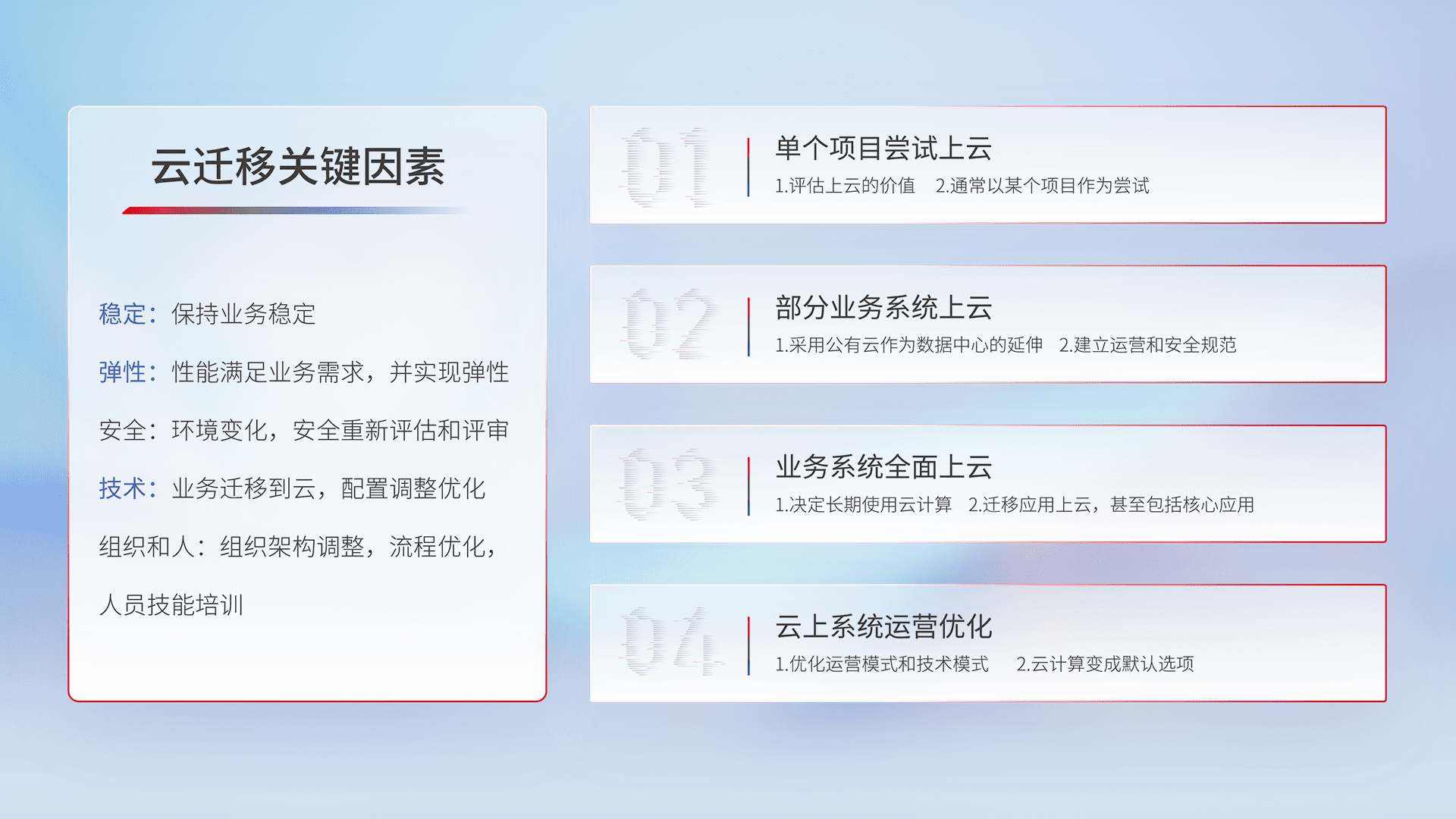 结合实际业务,,,从规划设计、、、云平台选型、、、、云原生改造、、、、数据迁移、、集成交付,,,迁移全过程为客户识别最佳上云路径,,,,做好风险识别管理,,,设计网络架构、、、、身份权限、、安全审计合规、、、、操作审计、、、日志审计、、监控告警策略、、、多站点容灾设计等,,对云上基础设施进行整体规划,,,提升IT治理水平,,,以满足弹性、、、高可用、、高性能的需求。。。